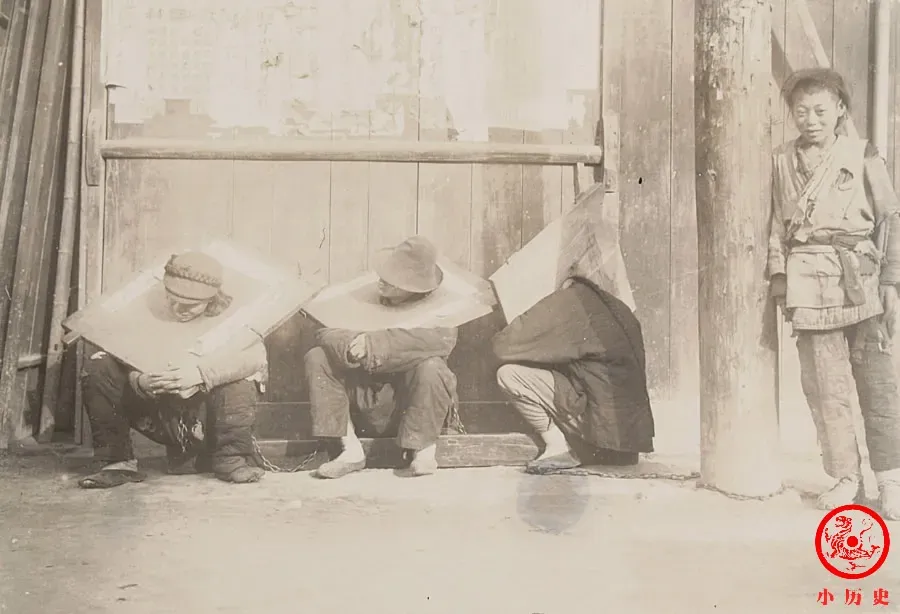 三个人分别戴着枷板,还被铁链捆在一起,很可能是卷入了同一桩案件。当摄影师准备拍照的时候,他们纷纷转过头去,不敢直面镜头,显然感到不好意思。
