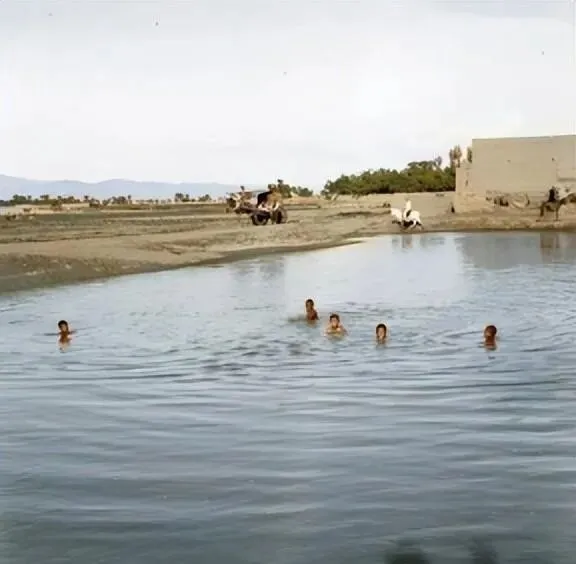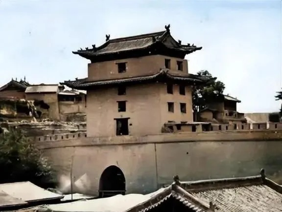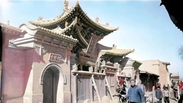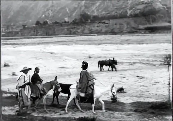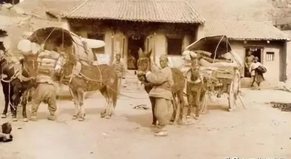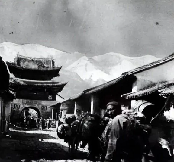 照片里的商队 , 牵着马扛着货 , 正往城门口走 , 最右边一个男人还回头看镜头 , 前方就是层峦叠翠的山 , 再往前 , 就是更西边的边疆了。