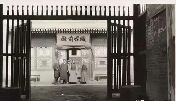 大户人家的太太 , 站在对联前拍照 , 穿得很讲究 , 仔细看能发现 , 她裹了小脚。