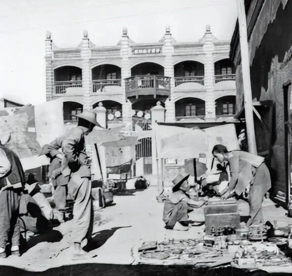 150年前的兰州 , 已经有电线杆了 , 有三层洋房 , 有织造工厂 , 街头小吃摊一排排碗摆着 , 给钱就能吃~