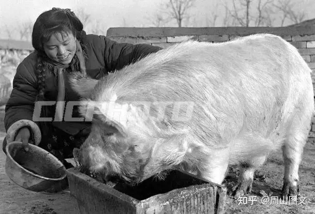 ▲寿张县大布人民公社沙土集生产大队养猪场模范饲养员魏焕荣正在精心喂养优良品种约克夏大种猪。(现为阳谷县大布乡,1961年摄)