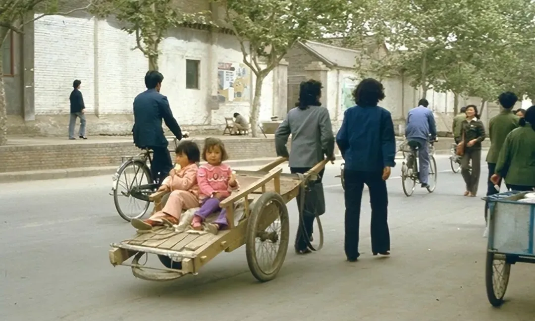 这是1984年洛阳街头的日常一幕,一位母亲拉着手推车赶路,车上是两个可爱的孩子,旁边有人骑自行车经过,大人们衣着朴素,孩子们却穿得五颜六色。