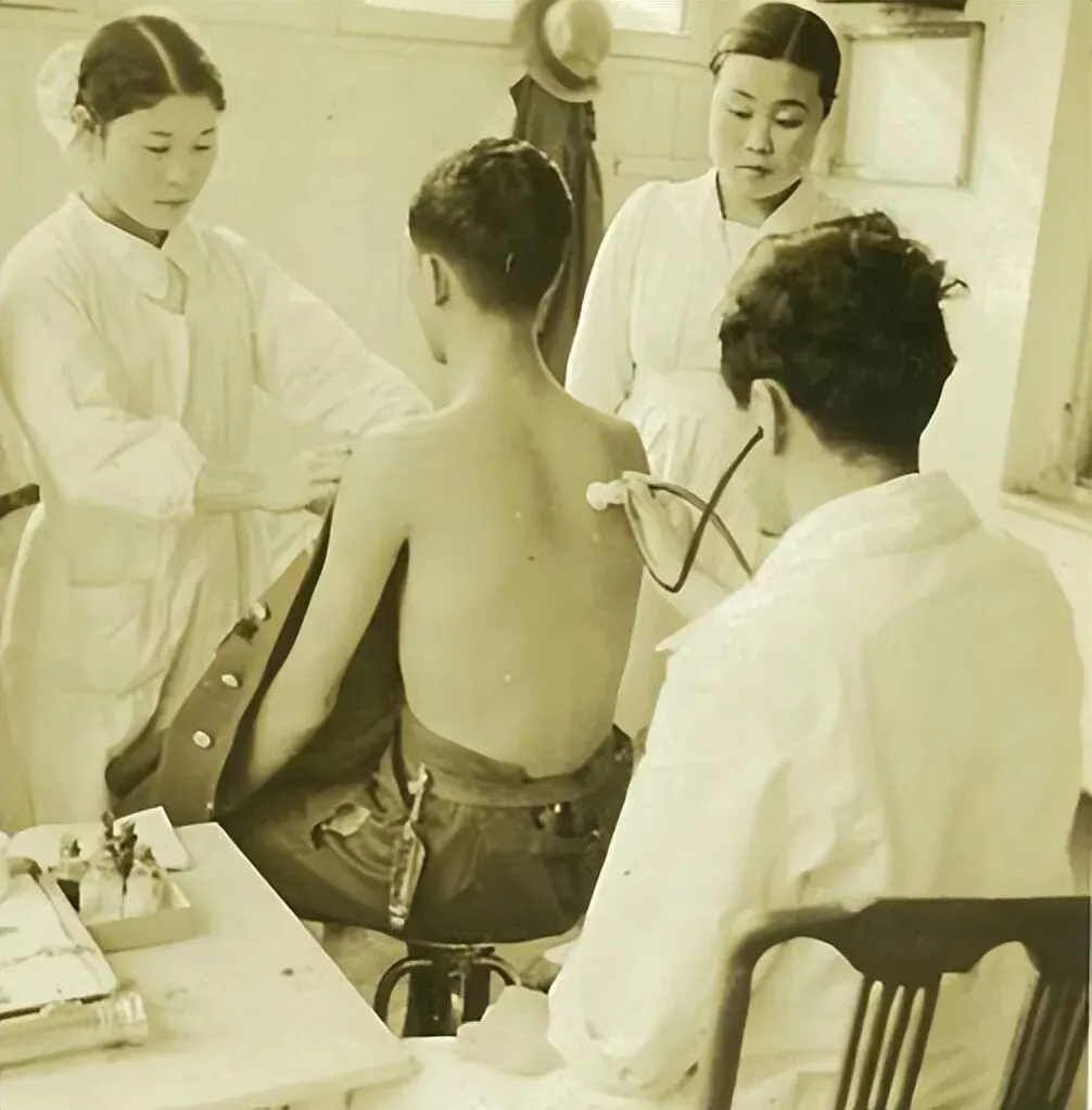 1937年10月,七七事变已经过去三个月,这张照片是日本摄影师荒木在华北拍的。画面里,一群穿白大褂的医护人员正在给一个赤膊的男子检查身体,有人拿着听诊器,有人整理衣物,桌上摆着医疗器具。