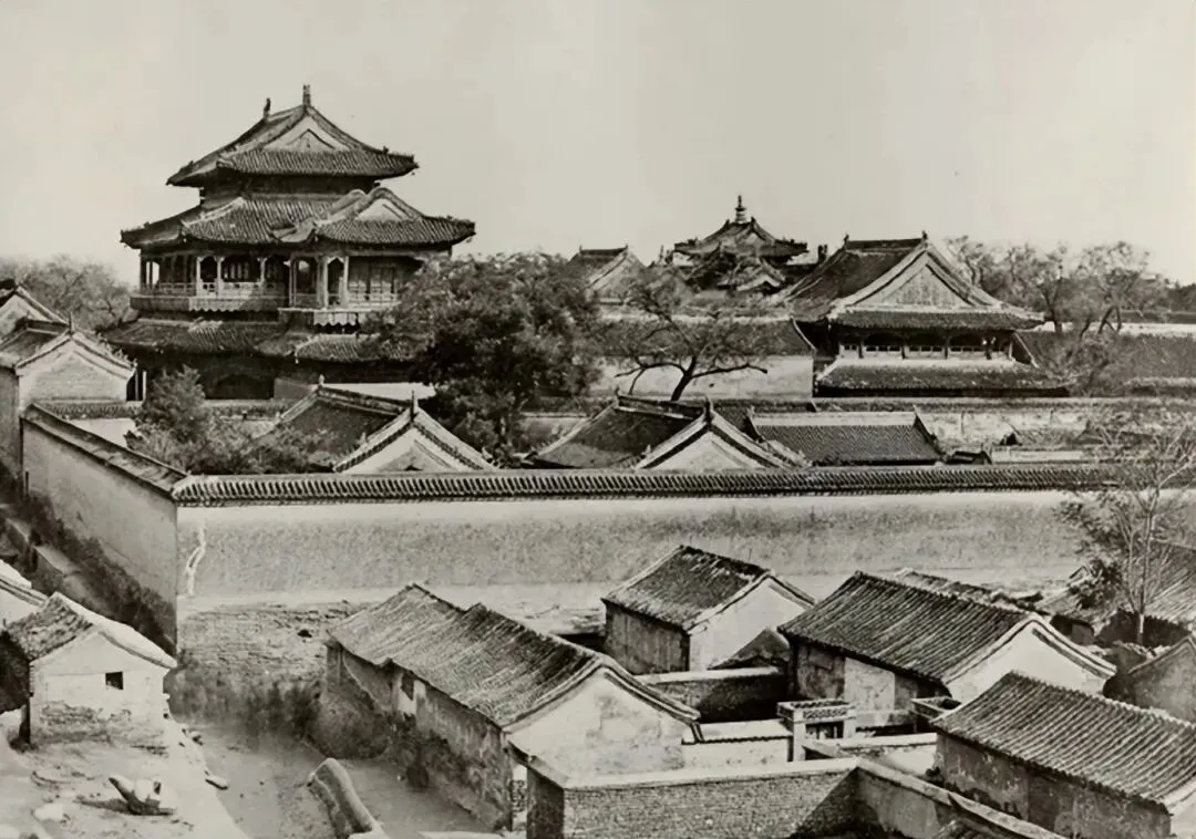 这张拍的是1860年的雍和宫万福阁,这座三层大殿气势恢宏,左右还有延绥阁和永康阁,万福阁建于1748-1749年间,里面供奉着用整根白檀木雕成的弥勒大佛,这根木头是西藏七世达赖喇嘛花重金从尼泊尔买来的,从西藏经四川走水路,足足运了三年才到北京。