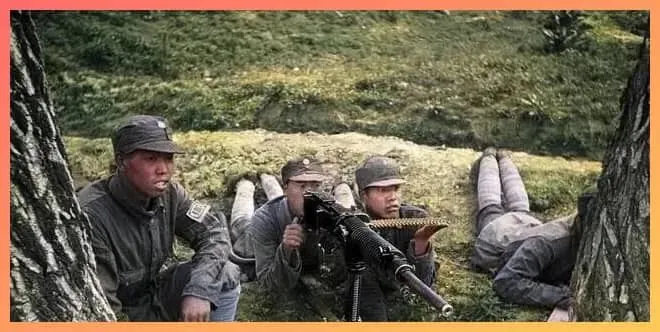 机枪阵地,几个人分工协作,有的握把,有的喂弹,有的警觉地观察。树干成了天然掩体,草叶贴着脸颊,没人说话,只有虫鸣和喘息在空气中流转。这种安静,比任何台词都更有力量。