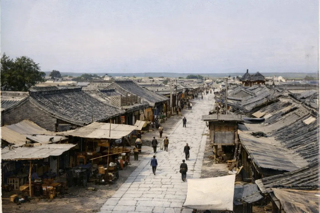 石头路两边是绵延到远处的店铺,有些店铺有着好看的招幌。建筑是北京一带的传统建筑,清水脊,近处可见瓦片,下方的石片屋顶似乎隐约可见……