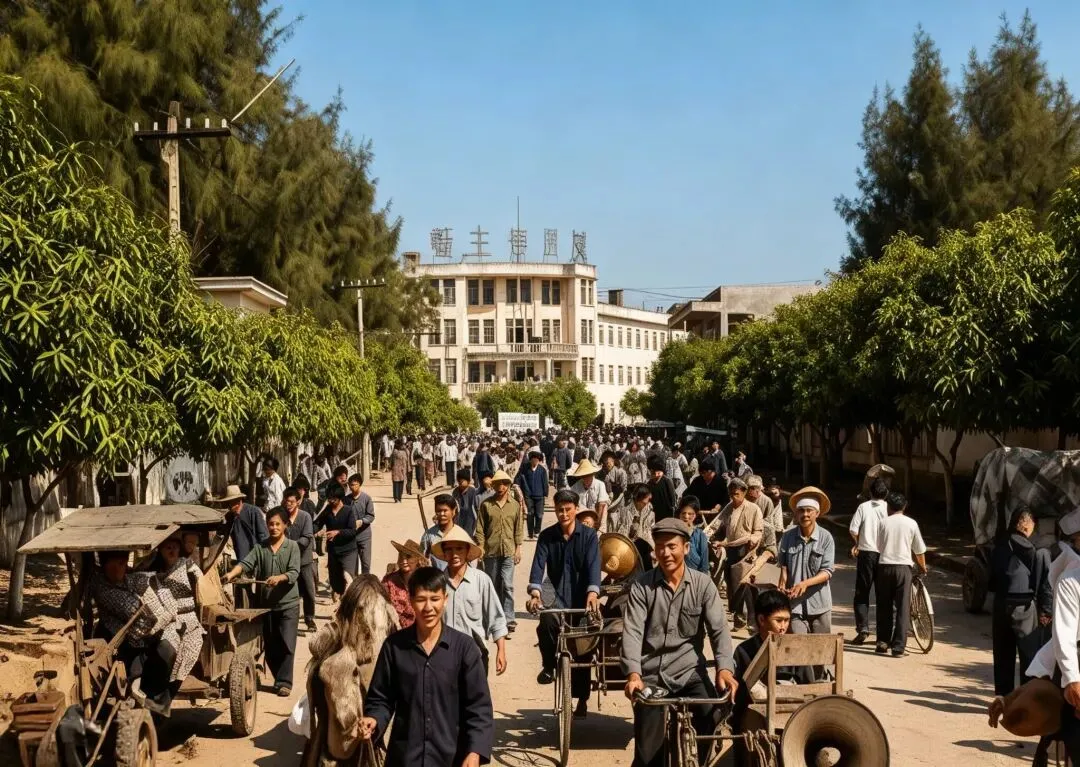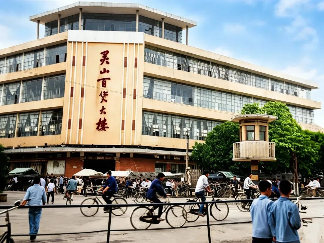 六峰公园的山门见证了旅游业的兴起。1992年公园重新修缮后,仿古的牌楼下,卖酸嘢的阿婆用竹篮提着玻璃罐,里面泡着芒果、菠萝,五毛钱一串。山上的北帝庙前,香客们的手机铃声与晨钟暮鼓交响,数字化的香火捐赠二维码贴在功德箱旁。从最初的烈士陵园到后来的文化公园,六峰公园就像一部立体的县志,记录着灵山从政治挂帅到文旅融合的观念转变。彩色照片开始在八十年代出现,灵山县城的轮廓逐渐清晰。百货大楼前的自行车流构成城市的动脉,永久牌、飞鸽牌的车轮碾过青石板路,载着穿的确良衬衫的青年奔向新生活。楼体上"发展经济,保障供给"的红色标语旁,个体户老张支起的甘蔗摊前排起长队,他用算盘计算价格的噼啪声,与国营商店里"同志,打张发票"的吆喝声交织成时代交响。灵山电影院的海报墙是县城的"信息中心"。《少林寺》上映时,售票窗口前的队伍从凌晨排到深夜,票价两毛五的电影票成为年轻人最奢侈的娱乐。影院前的小广场上,录像厅老板用高音喇叭播放着香港武打片的片段,吸引着怀揣零花钱的少年。穿中山装的干部与戴蛤蟆镜的时髦青年擦肩而过,供销社的搪瓷盆与地摊上的电子表在橱窗里争夺视线,计划经济的严谨与市场经济的活力在这座小城奇妙共存。汽车站的老照片记录着流动的中国。绿皮解放牌客车扬起的尘土中,挑着荔枝筐的农民与背着录音机的"倒爷"挤在同一站台。1985年灵山汽车站扩建后,每天发出的班车从12班次增加到36班次,将本地的荔枝、龙眼运往南宁、北海。站台上"文明乘车"的标语牌下,梳着麻花辫的售票员小李正用带着白话口音的普通话报站,她胸前的"先进工作者"奖章在阳光下闪闪发亮。最令人瞩目的变化发生在田间地头。当市场经济的春风吹过红土地,灵山人敏锐地发现荔枝比水稻更有价值。1996年,县里举办首届荔枝节,土法嫁接的"桂味""糯米糍"通过冷链车运往北京上海。老照片里弯腰插秧的农民,如今站在荔枝园里用直播带货,手机屏幕上跳动的订单数字,比当年粮票上的定量更令人心安。2000年,灵山被农业部命名为"中国荔枝之乡",35万亩荔枝林成为农民的"绿色银行"。
