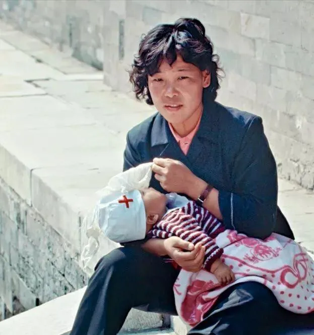 这位妈妈怀里抱着熟睡的娃,白布小帽上绣着红十字,脚边搭着毛毯,她眼里有点累却很温柔,台阶上的太阳晒得暖融融,奶奶说那时候带孩子就靠怀抱和摇篮曲,现在推车安全座椅样样齐全,辛苦没变。