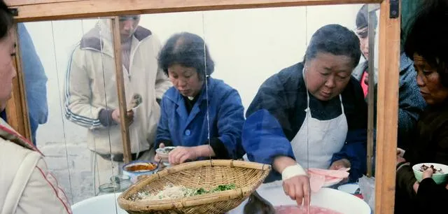 小木柜透明挡风,搪瓷大盆里漂着粉皮,葱花酱油辣椒一排排摆好,掌勺阿姨手腕一抖,粉皮在汤里一翻身就上碗,撒上花生碎和香菜末,三角小凳一坐,吸溜两口暖到胃里,爸爸说赶集日要早去,不然卤味先卖光。