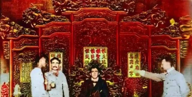 图中这张最扎眼,金漆雕龙盘在靠背上,嘴张着像要吐云,底下却坐着个外路人,旁侧几个还在指指点点,一副兴致勃勃的样子,奶奶摇头说那会儿城门失守,规矩先碎了,龙椅也成了合影的背景。