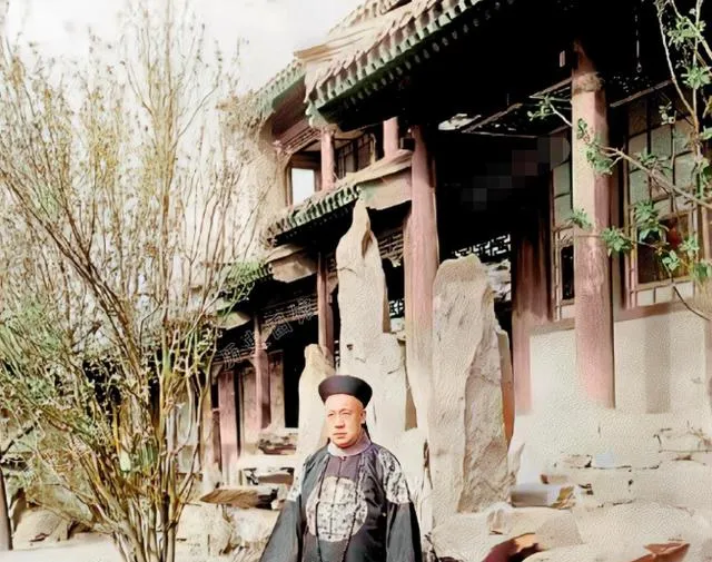 这个人立在自家后院,湖石旁挤着几株枯枝,回廊影子斑驳落在青砖上,衣襟团寿补子绣得密,手背绷得紧,表情淡淡的,像被叫来拍一张就散场。