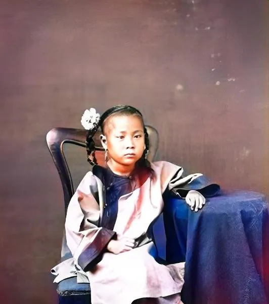 这个孩子穿得体面,耳边夹一朵小花,肩上叠着软亮的织料,桌边伸出的那只脚被裹得尖尖的,像一只白色小舟,镜头里看不见疼,礼法却压在她的眉眼上。