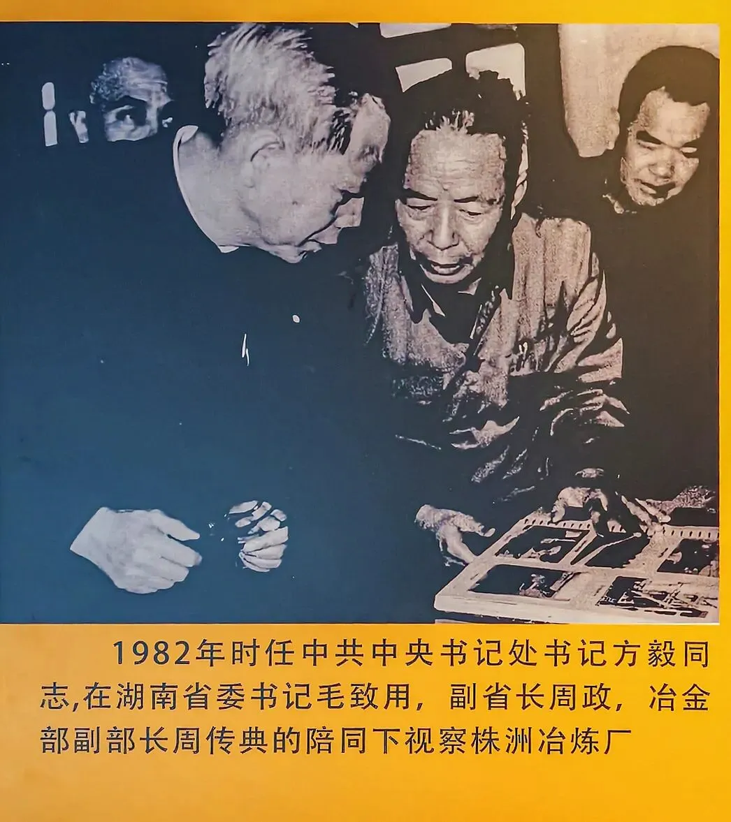 ▲1982年时任中共中央书记处书记方毅同志,在湖南省委书记毛致用,副省长周政,冶金部副部长周传典的陪同下视察株洲冶炼厂。