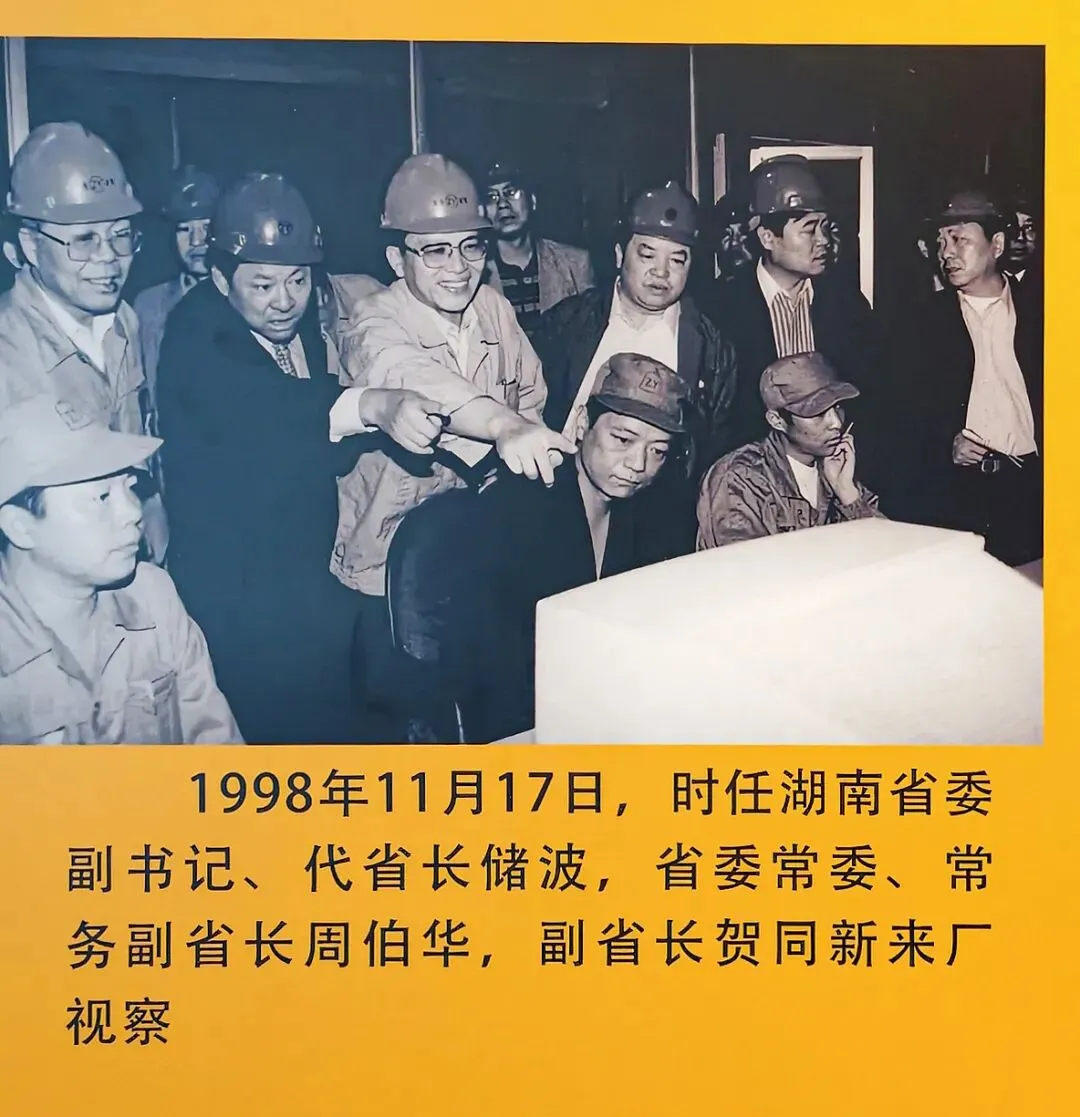 ▲1998年11月17日,时任湖南省委副书记,代省长储波,省委常委,常务副省长周伯华,副省长贺同新来厂视察。