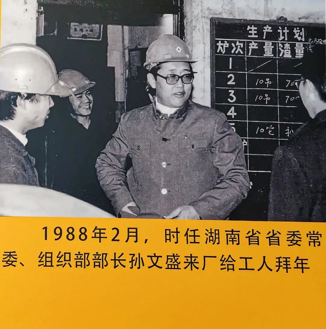 ▲1988年2月,时任湖南省省委常委、组织部部长孙文盛来厂给工人拜年。