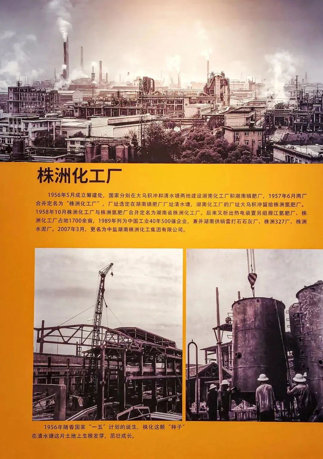 1956年5月成立筹建处,国家分别在大乌积冲和清水塘两地建设湖南化工厂和湖南磷肥厂,1957年6月,两厂合并定名为"株洲化工厂",厂址选定在湖南磷肥厂厂址清水塘,湖南化工厂的厂址大乌积冲留给株洲氮肥厂。1958年10月,株洲化工厂与株洲氮肥厂合并定名为湖南省株洲化工厂。后来又析出热电装置另组湘江氮肥厂,株洲化工厂占地1700余亩,1989年列为中国工业40年500企业,兼并湖南供销雷打石石灰厂、株洲327厂、株洲水泥厂。2007年3月,更名为中盐湖南株洲化工集团有限公司。