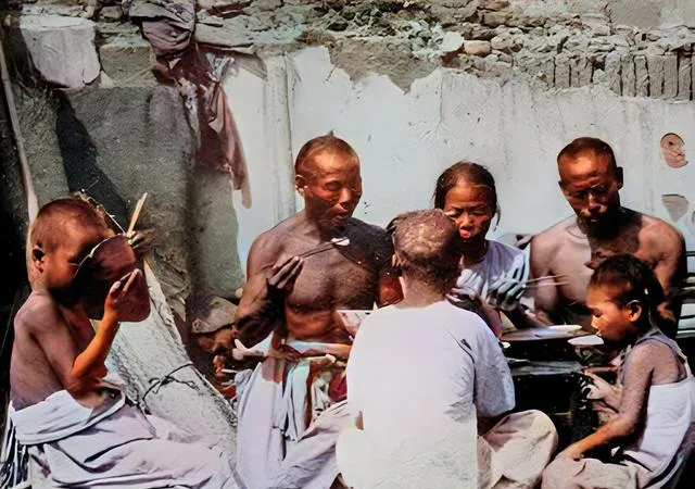 这桌饭没有菜色可夸,孩子们光着上身围坐一圈,碗里清汤热气不大,有人端着碗遮脸有人扒拉凉馍头,爷爷说那时候能吃饱就是福,现在人人讲控糖讲配比,那会儿哪想得了那么细。