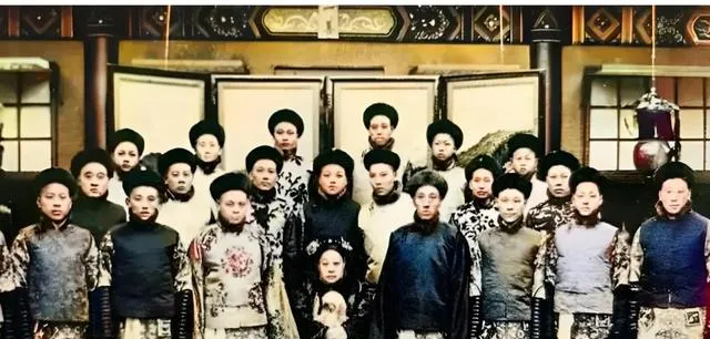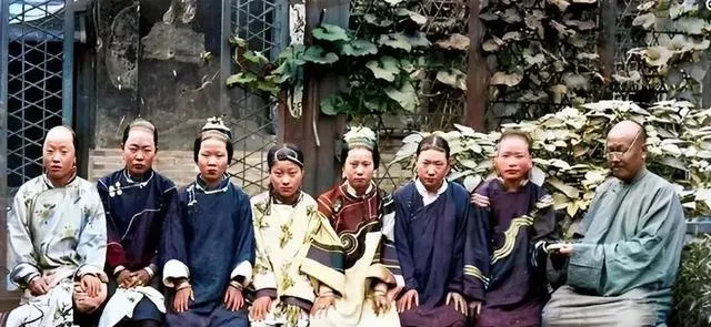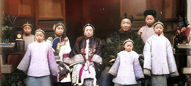 男主人穿貂氅端坐居中,旁边一妻一妾,孩子们一字排开,左边已婚女子的头饰明晃晃,谁坐哪里都讲究,照片里一眼能看出主次。