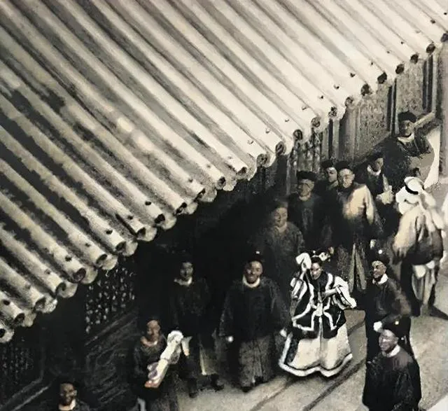 这一幕像被谁从高处偷着按了快门,檐瓦压下来像黑色的浪,檐下人群围着一位华服女子匆匆走过,反光一闪就没了,据说宫里不许随意照相,偶得一张就像捡了宝。