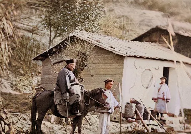 这个人一腿搭鞍一手提刀一手牵缰,身旁童仆扛着行李,屋前土墙斑驳,狗在脚边绕,文官乘轿武官骑马这句话放在这张照片上最贴切。
