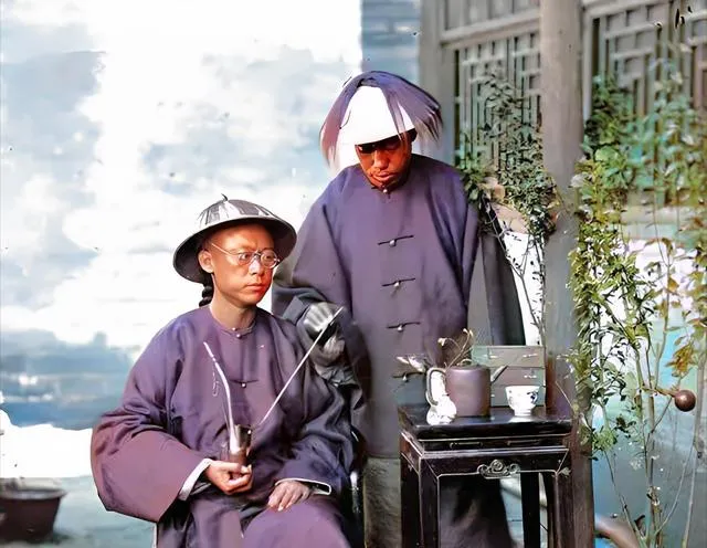 器具摆在小几上,长嘴的水烟壶透着冷光,老爷端坐侍者立侧,袖口宽大垂到膝,水烟一入口喉间一滚,吐出的雾气绕着檐柱散开,待客小聚来这么两口,算讲究。