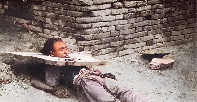 这个木枷粗糙厚重,人倒在砖角边脸朝外,灰土里露出一截胳膊,没人声张只有太阳在头顶烤,旧律法的阴影就这样压在地上。
