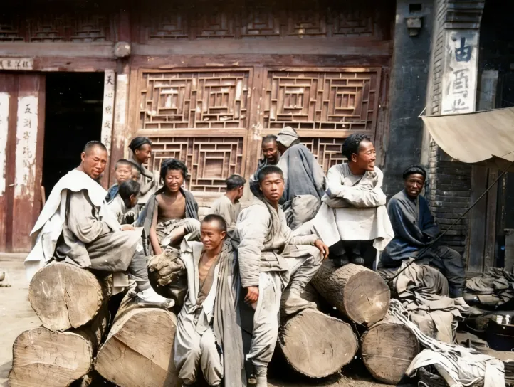 图中这一群人坐在粗大的木桩上打盹晒背,衣服灰扑扑的,棉布单衫宽大垮在肩头,袖口磨得发白,门楼后的木格窗像一面暗红的棋盘,最靠边的小哥咧着嘴笑,应该是和旁边的人说了句俏皮话,胳膊肘一杵木头,整个人就松快下来,另一边两个小哥瘦得见骨,锁骨像弓弦绷着,爷爷看这种照片常叹一声,说那会儿人力就是饭碗,坐在这儿多半是等着有人喊一嗓子去抬货干活,等不到就再晒一会儿,天黑了各回各家,家在哪儿也说不准。