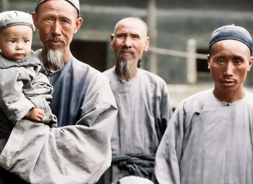 这个镜头叫一家子的抚肩而立,粗麻布长衫垂到膝盖,男人的胡须被风吹得有点翘,小孩贴在大人怀里睁圆了眼睛,表情不算夸张,却把日子里的沉默都照出来了,仔细看,眼神里更多是打量和防备,像在问镜头你是干啥的,奶奶说以前照相是大事,不是随手一拍的玩意儿,站定了别眨眼,面无表情才显得稳重,如今手机一举就是笑脸和剪刀手,变化就这么悄悄发生在镜头里。