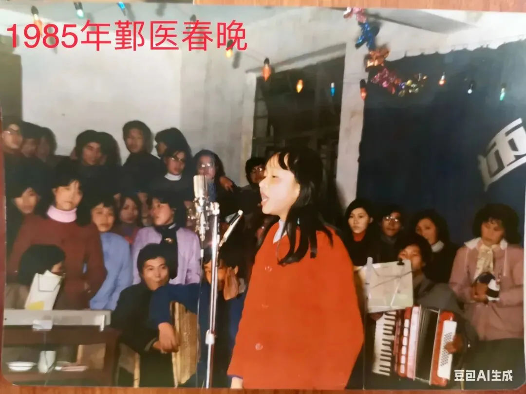 这张旧照,记录了1985年在鄞县人民医院食堂餐厅举办的春节联欢会,也是我工作后第一次站上医院春晚的舞台,独唱曲目是《妈妈的吻》。