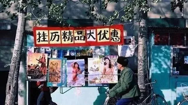 图中这溜摊位就是我们小时候的“商场”,红布横幅写得豪横,挂历一字排开,姑娘们笑得明亮,风吹树影晃在纸面上也显得好看,买一份回家就像给客厅装了窗。妈妈说,挑挂历得看纸厚不厚,铜版纸翻着手感顺,挂一年也不卷边。