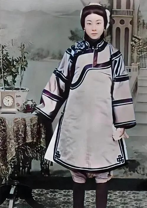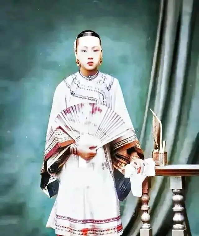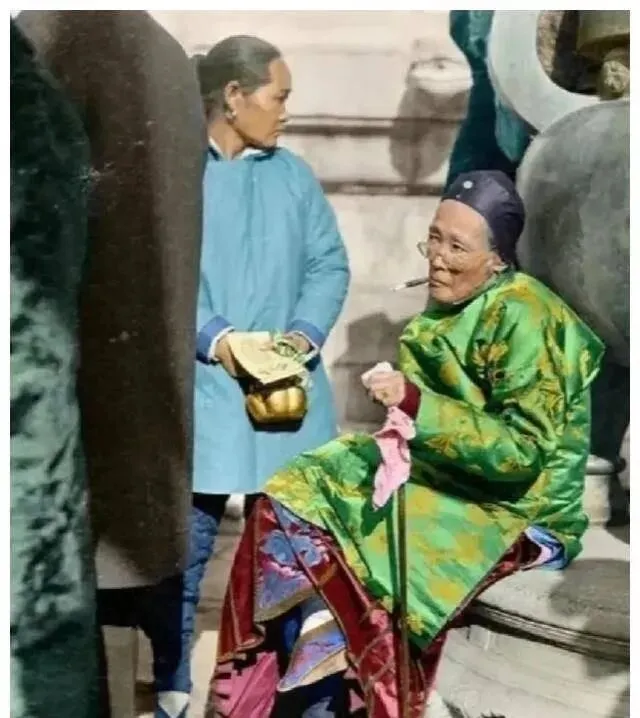 旁边站着个穿蓝衣服的 , 估计是伺候她的下人。