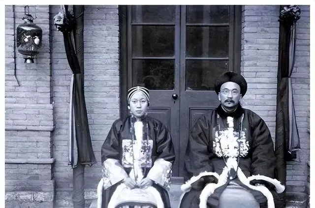 照片里这对夫妻 , 坐在砖瓦房前 , 男的穿长袍戴黑帽 , 女的戴头巾 , 两人表情都挺严肃。 门边挂着灯笼 , 两侧垂着布幔 , 看着像是中等人家。
