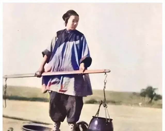 照片里这位 , 蓝紫色衣服 , 肩上挑着扁担 , 一头挂着陶罐。 你看她眼神 , 麻木得很 , 像是什么都不指望了。