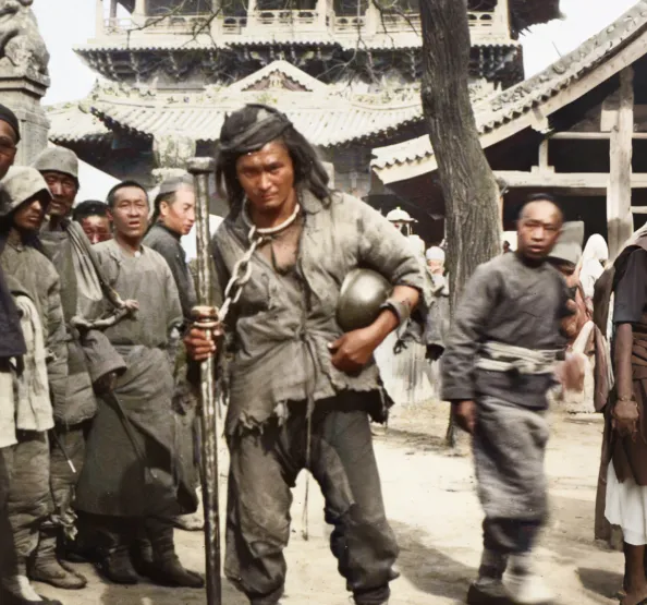 图中这个汉子抓着一根黑乎乎的铁棒,脖颈和脚腕用锁链拴着,另一只手夹着一个钵,衣衫破得见风就透,偏偏眼神硬朗,走一步铁链就“哗啦”一响,旁边人围着看,他却不搭理,像是把苦当成路走,这样的装扮在集市上并不常见,爷爷说大概是发愿修行的人,棒子是靠身的家伙,日夜不离,走起来费劲,可心里有火就不怕累。
