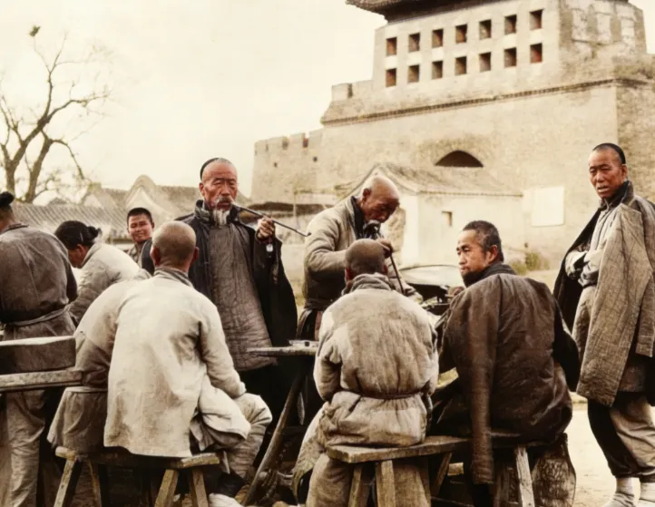 这张最接地气,木条凳围着一圈,几位老人叼着长烟杆,衣服打着补丁,墙根儿一壶热水在冒气,桌上估计是几碗茶汤,男人们围坐聊天,谁也不抢着说话,风吹过城门洞,灰扑扑的,却暖,小时候跟爸爸去镇上赶集,他总爱让我在茶铺门口等,他说先喝口水再办事,人活着就靠这口顺气。
