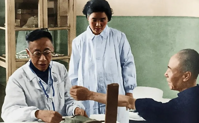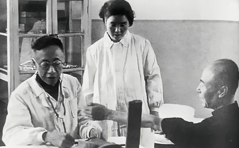 这张照片里,溥仪穿着白大褂,脖子上挂着听诊器,坐在桌前,正专注地给患者诊治,一旁还有位女医护人员,像是在辅助他 。