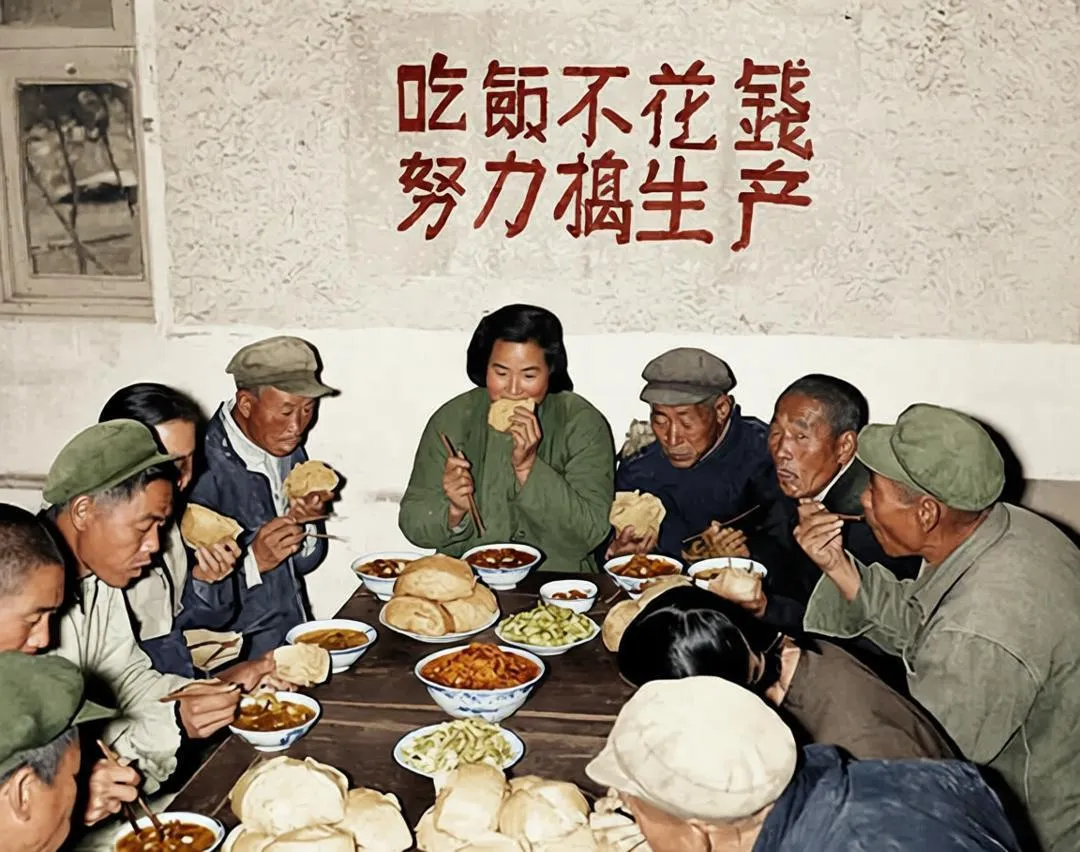再看背景墙上,“吃饭不花钱 努力搞生产” 的标语十分醒目。在人民公社化运动初期,公共食堂的设立,本意是为了体现社会主义制度的优越性,解放农村妇女劳动力,同时也便于组织和调配生产资源。人们不用再为一日三餐发愁,满心想着能齐心协力把生产搞上去,过上好日子。
