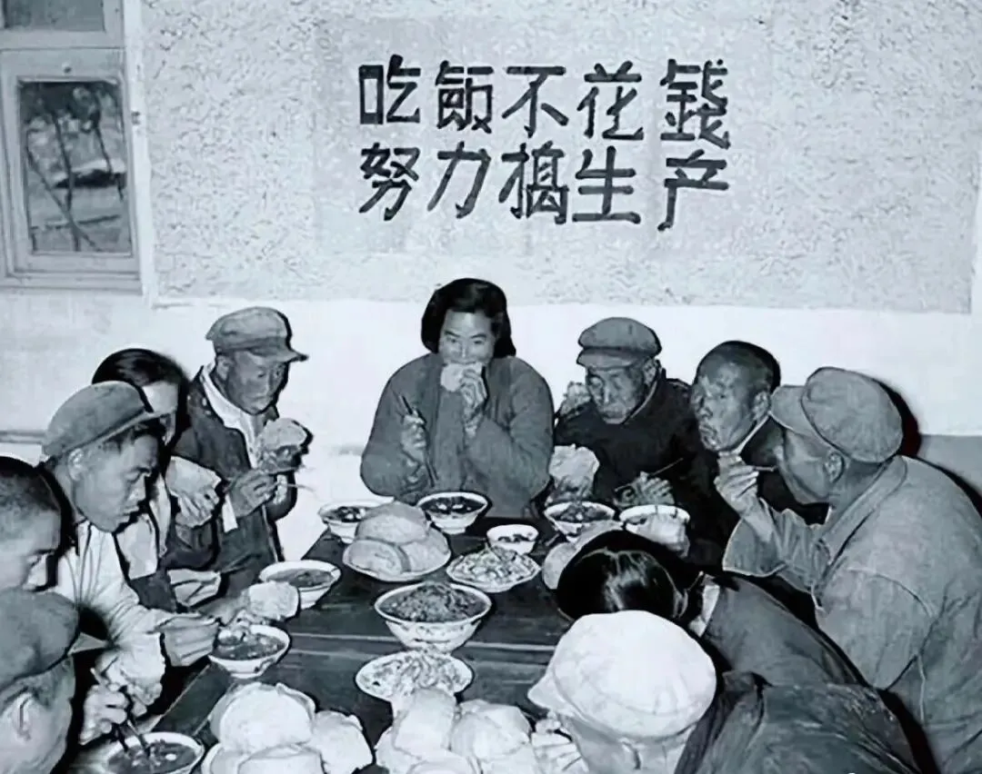 照片里,一张大桌子旁,围坐着不少老百姓。他们穿着朴素的衣裳,脸上带着那个年代特有的质朴。桌上满满当当摆着馒头、菜肴,虽然现在看来食物不算丰盛,但在当时,这可是 “吃饭不花钱” 的新鲜事儿。大家有的正专注地往嘴里送着饭菜,有的则抽空和身边的人说着话,你一言我一语,热热闹闹的。
