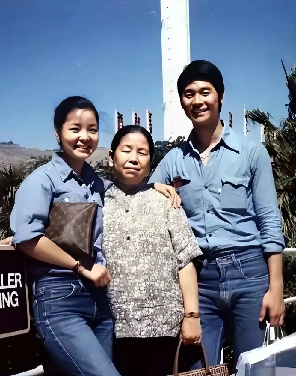 画面中,邓丽君身着蓝色牛仔衬衫,搭配同色系牛仔裤,简约又时尚。她笑容甜美,眉眼弯弯,手中随意拿着一个小包,尽显优雅气质。站在她身旁的三哥,同样穿着蓝色牛仔衬衫和牛仔裤,面带灿烂的笑容,一手自然垂下,一手轻轻搭在妈妈肩上,流露着亲昵与温情。妈妈身穿一件花纹上衣,朴素中透着亲切。她神态温和,虽没有像子女那般露出开怀的笑容,但眉眼间满是慈爱。