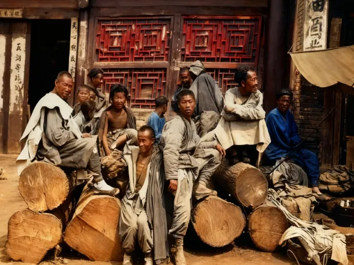 这伙人是等活的短工,衣裳灰扑扑的,缝缝补补补了又补,有人靠在原木上眯眼打盹,有人抱着膀子发呆,肋骨隐约能看出来,画面里没有台词,却能听见肚子咕咕叫的声音,小时候听大人讲,活儿来了就有人招手,没人招就饿着,日头一落,今天就算输了,现在的年轻人说加班累,放在那阵子,这样的累是常态。