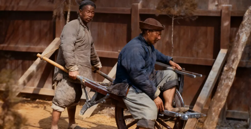 这个木家伙叫独轮车,中心一只大轮子,左右两条扶手,铁皮加固在边角,前端还拴着皮绳防滑,后面的人弓着背推,前面的人坐着或抱货,那轮子滚过土路,吱呀声一路拖长,我爸说以前挑不动的就上车,人抬货推,力气就是票子,如今马路平,车子多,独轮车见得少了,可那股子咬牙劲还记得。