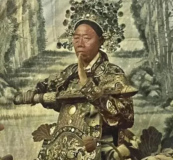 图中这位就是李莲英,头上压着一圈一圈的珠翠,胸前挂甲叠甲,手里还按着一把造型夸张的刀,脸却是坑坑洼洼的,近看油光里冒着疙瘩,妆也遮不住,跟戏台子下来的角色似的,摆拍味儿很重,却遮不住那张真实的脸。