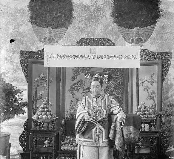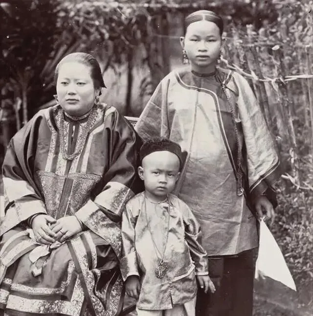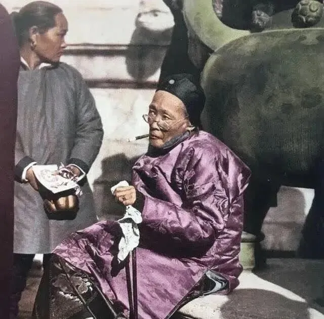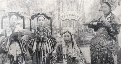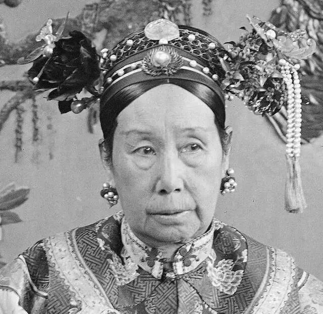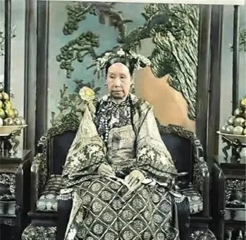 这个坐在中间的,就是慈禧,头发抹得润亮贴头,发冠上坠着珠串和翠翎,衣襟滚金,袖口里衬着细密的暗纹,气派是一眼就到位,可脸上眼袋沉沉,法令纹深,稍一抿嘴就显出疲态,珠子再多,也盖不住岁月那两刀。