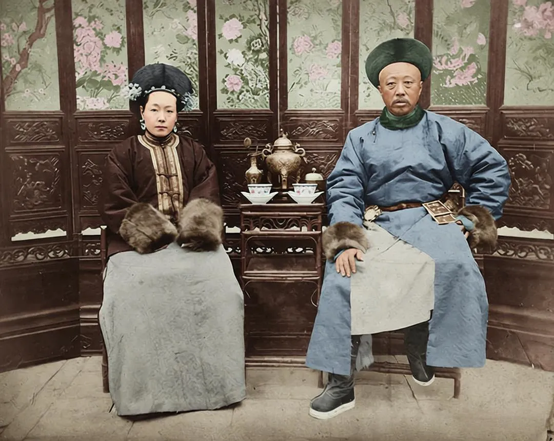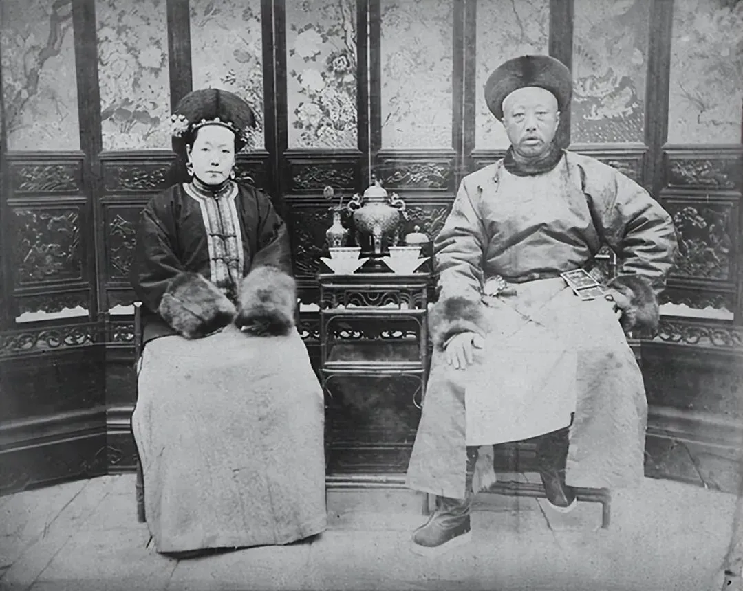 1880年,醇亲王奕譞与他福晋的合影。画面背景是带有花纹饰的古朴屏风,营造出典雅庄重的氛围;中间的小桌上摆放着器物,增添了生活意趣与仪式感。