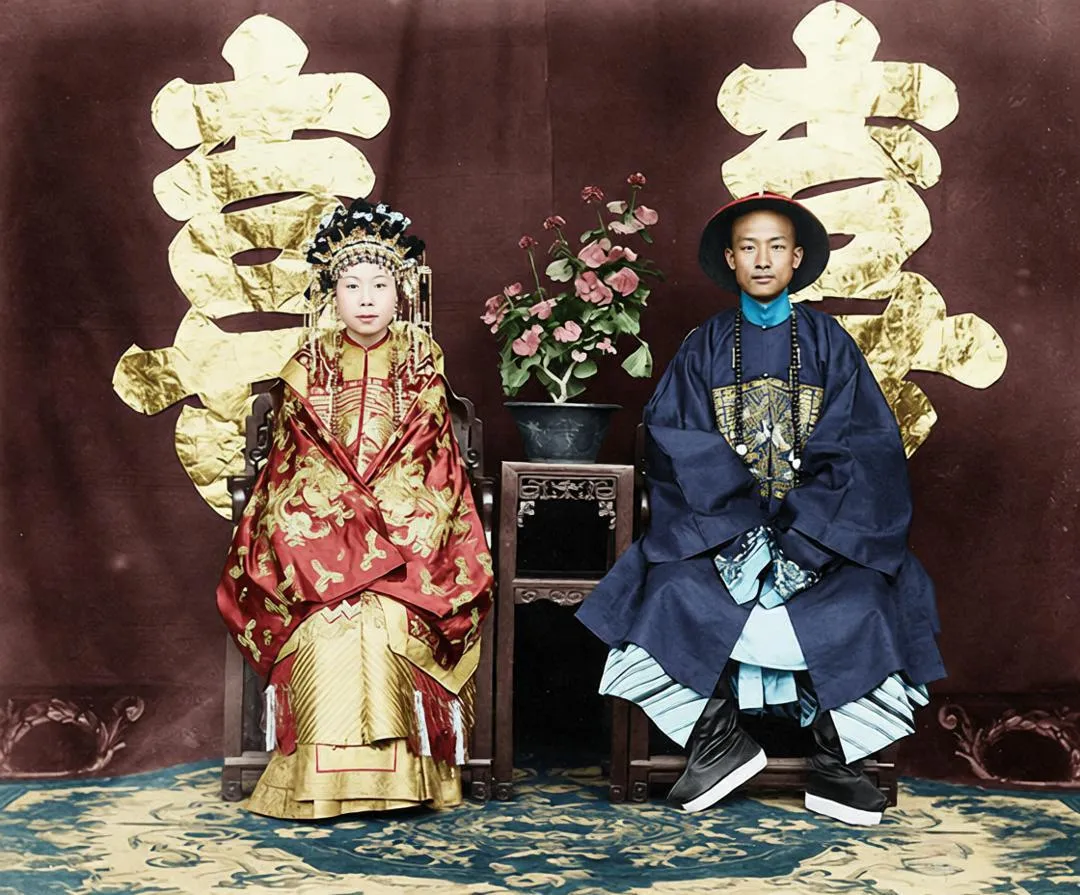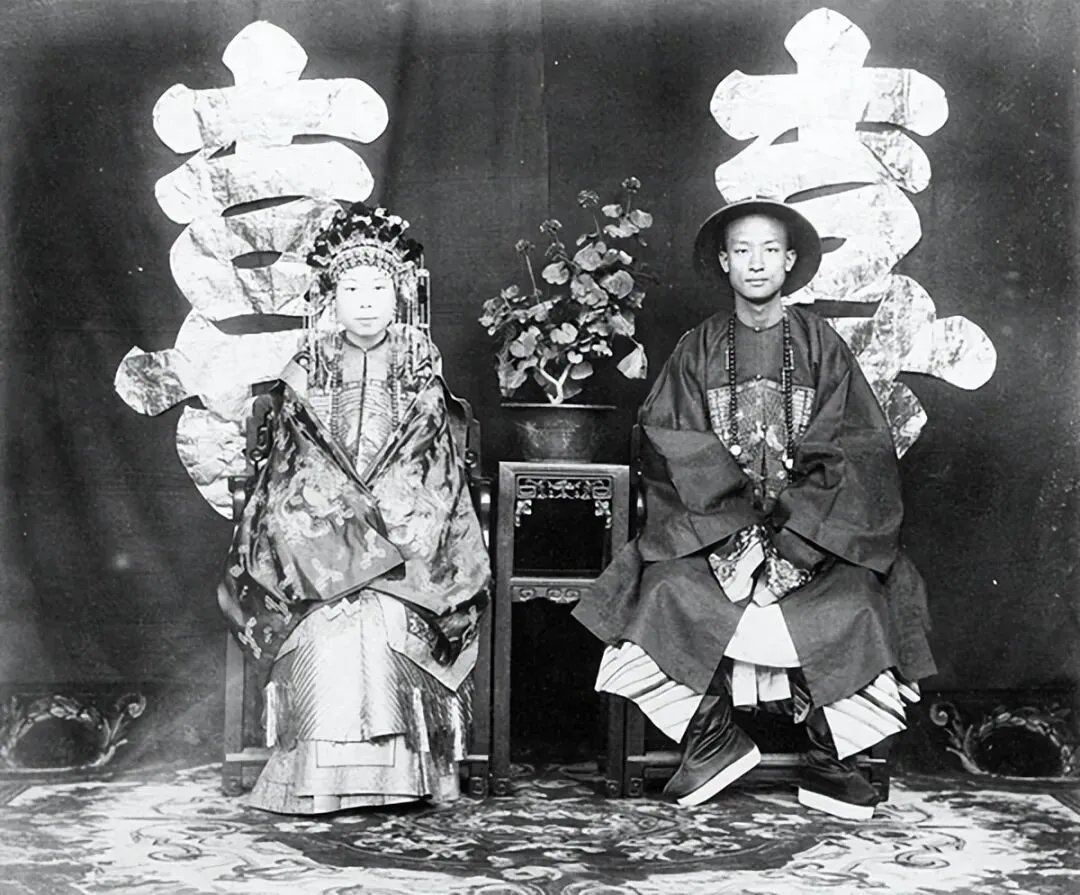 1870年,曾国藩孙女曾广珣与吴永的婚礼合影。画面背景衬着两个硕大的“喜”字,洋溢着婚礼的喜庆氛围;中间的桌案上摆放着一盆花卉,为场景增添了雅致生机。