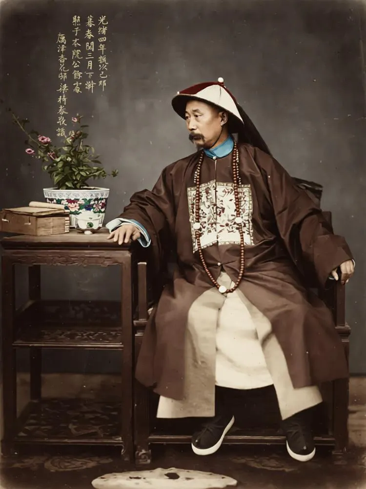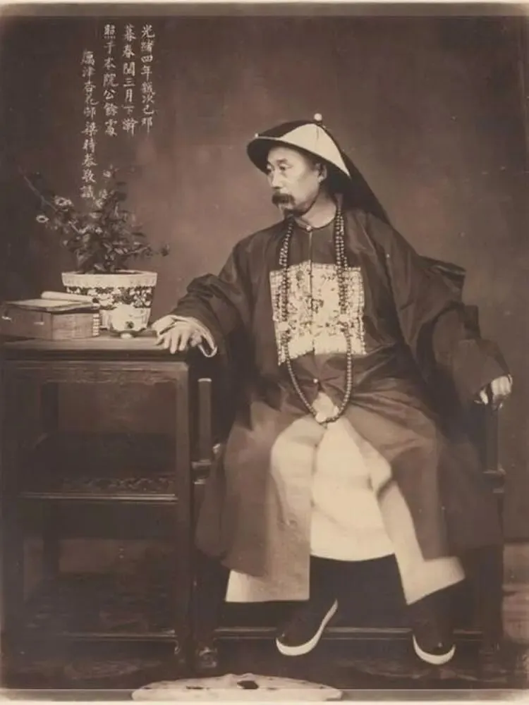 这是梁时泰于1878年(光绪四年)拍摄的李鸿章坐像。画面中,李鸿章身着清代官员的传统服饰,头戴顶戴花翎,身着饰有补子的长袍,颈间垂挂朝珠,神态沉稳地端坐在座椅上,左手自然搭在身旁的桌沿。