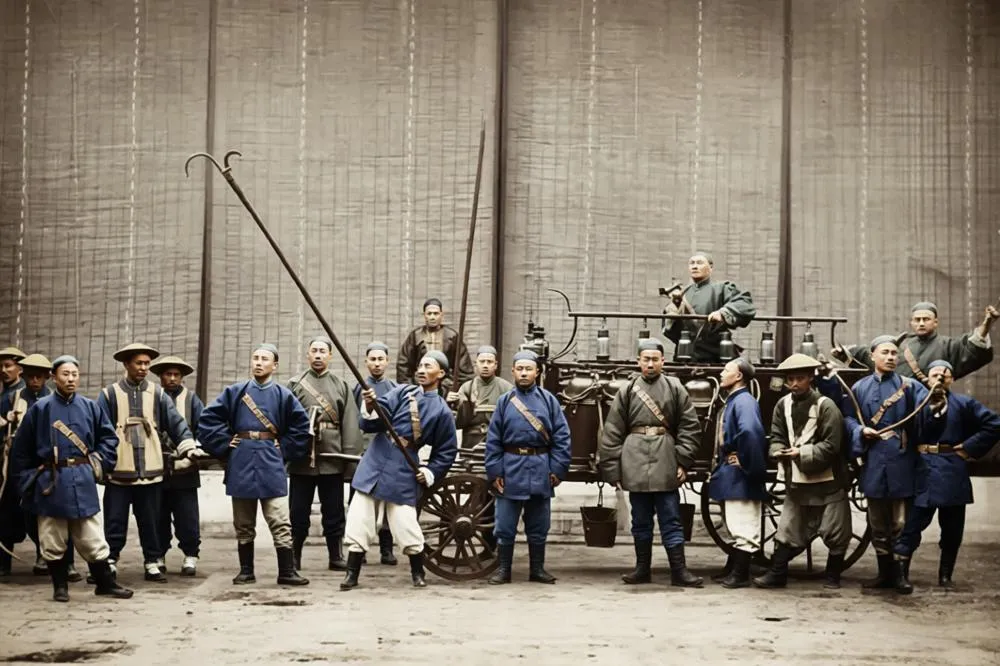 门前,救火队员们身着统一制服,头戴的帽子式样颇具特色,他们一字排开,姿态整齐。地面上,各类救火器材错落摆放:水桶、手压式喷水罐清晰可见,还有队员手持小号、斧子,小推车与梯子等工具也有序陈列。