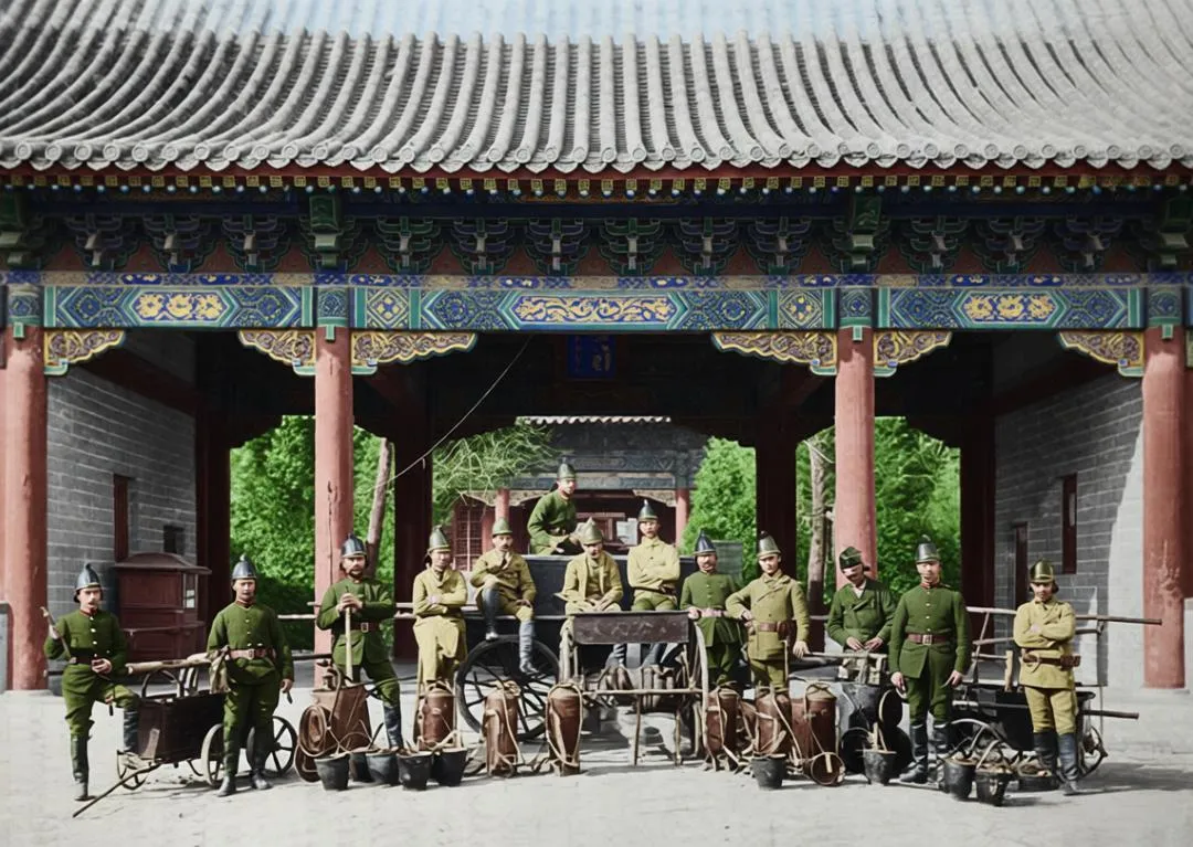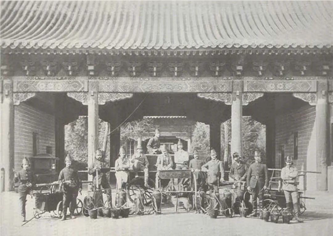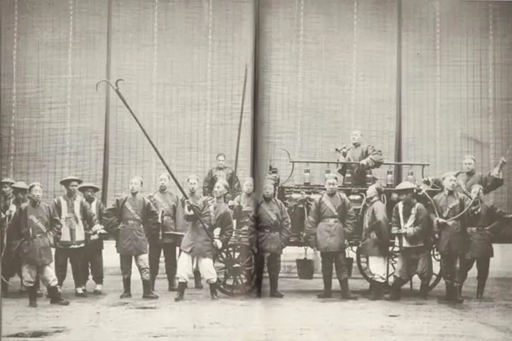 这张照片拍摄于1880-1900年代的上海丝业公会的救火队。队员们身着统一制服,个个精神饱满、意气风发。他们的装备清一色采用洋式,后方小车上的手压式喷水罐,与同时期北京英国使馆所用的颇为相似。