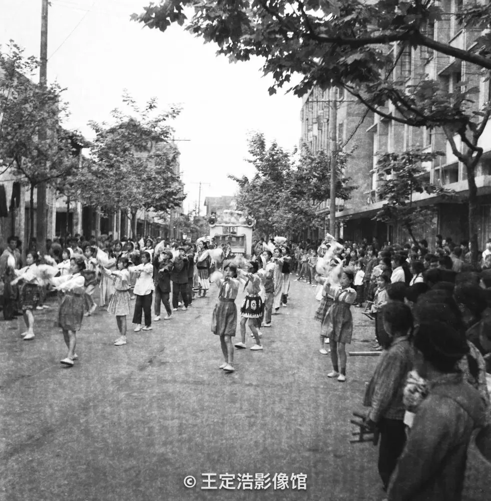 1977内江市纪念毛主席“五.七”指示发表11周年,内江棉纺织厂子弟校歌舞表演游行队伍经过交通路。