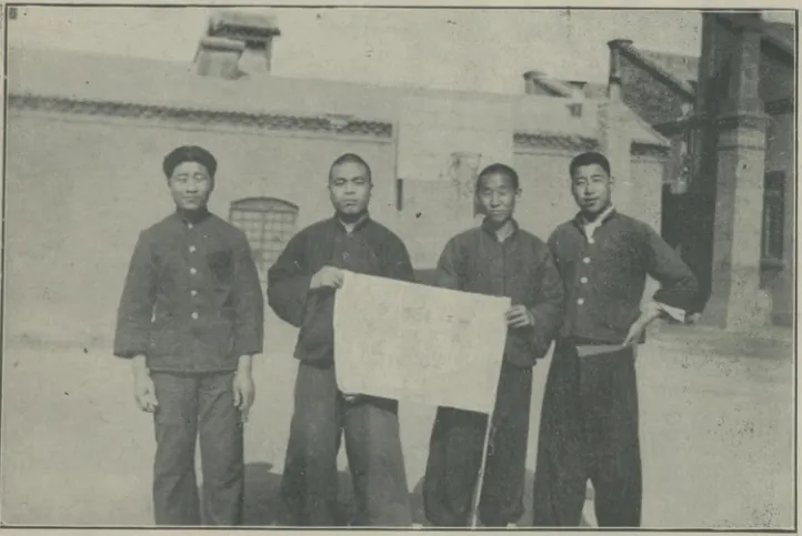 位于天津的河北工学院(今河北工业大学)工友补习班的学生慰劳前线将士出发前,摄于学校操场。